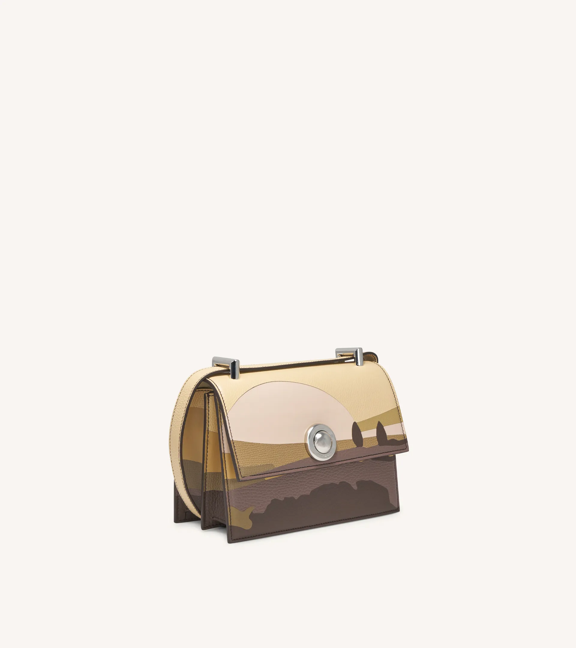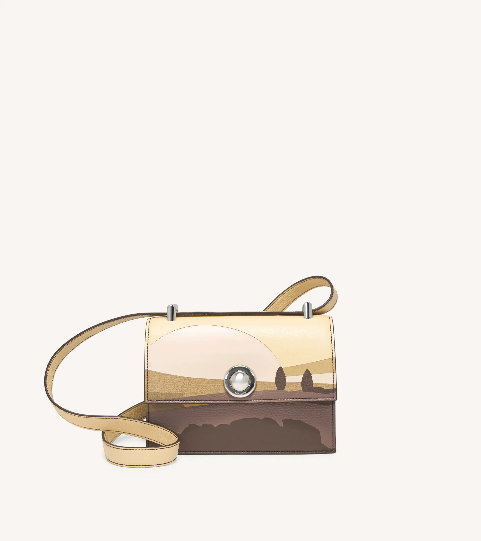 The Loren 20 shoulder bag draws inspiration from the grandeur of Bologna University's halls, emulating the shape of a stately book. The metallic hardware, inspired by the iconic eyelet detailing from leather shoes, pays homage to the brand's expertise in shoemaking.